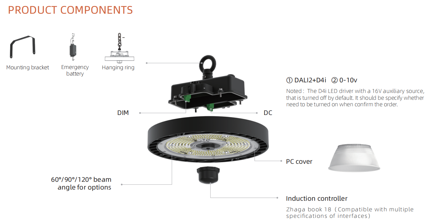 Multiple Power CCT Selection Smart High Bay Light with ZhagaBook 18 Interface, Support PIR Microwave Control